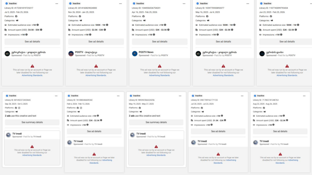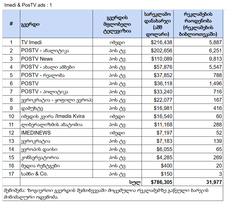 Meta-ს მონაცემებით, მხოლოდ 2026 წლის თებერვალში ,,იმედმა“ და POSTV-მ საკუთარ გვერდებზე არასრულ ერთ თვეში თითქმის 38 ათასი დოლარის ღირებულების დაახლოებით ათასი რეკლამა განათავსეს. ხოლო 2020 წლის აგვისტოდან 2026 წლის 25 თებერვლამდე პერიოდში, სხვადასხვა გვერდის მეშვეობით, ამ ორმა ტელეკომპანიამ Meta-ს რეკლამებში სულ მცირე 786,305 დოლარი დახარჯა – რაც ქართული მედიისთვის რეკორდული მაჩვენებელია.