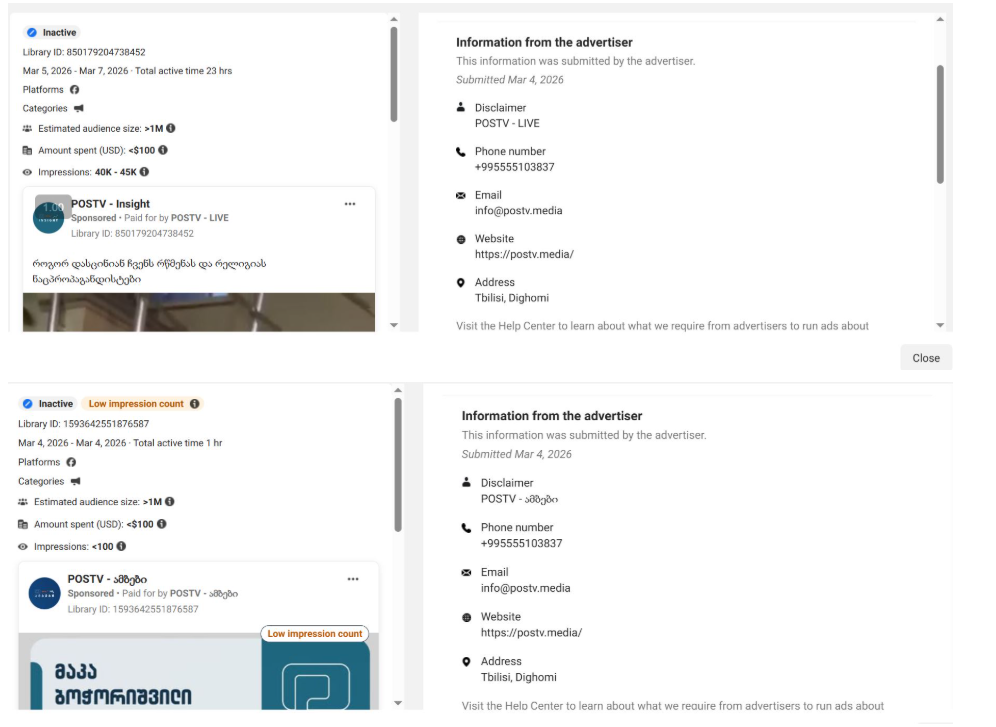 გვერდმა „POSTV – ამბები“ ფეისბუქზე ჯამში 111 რეკლამა განათავსა, რომელთა საერთო ღირებულებამ 493 დოლარი შეადგინა. ISFED-ის თქმით, რეკლამირებული პოსტები ძირითადად ანტიდასავლურ გზავნილებს შეიცავდა. გავრცელებული ნარატივების ნაწილი დასავლეთს წარმოაჩენდა მხარედ, რომელიც დაინტერესებულია უკრაინასა და ირანში მიმდინარე კონფლიქტების გაგრძელებით.