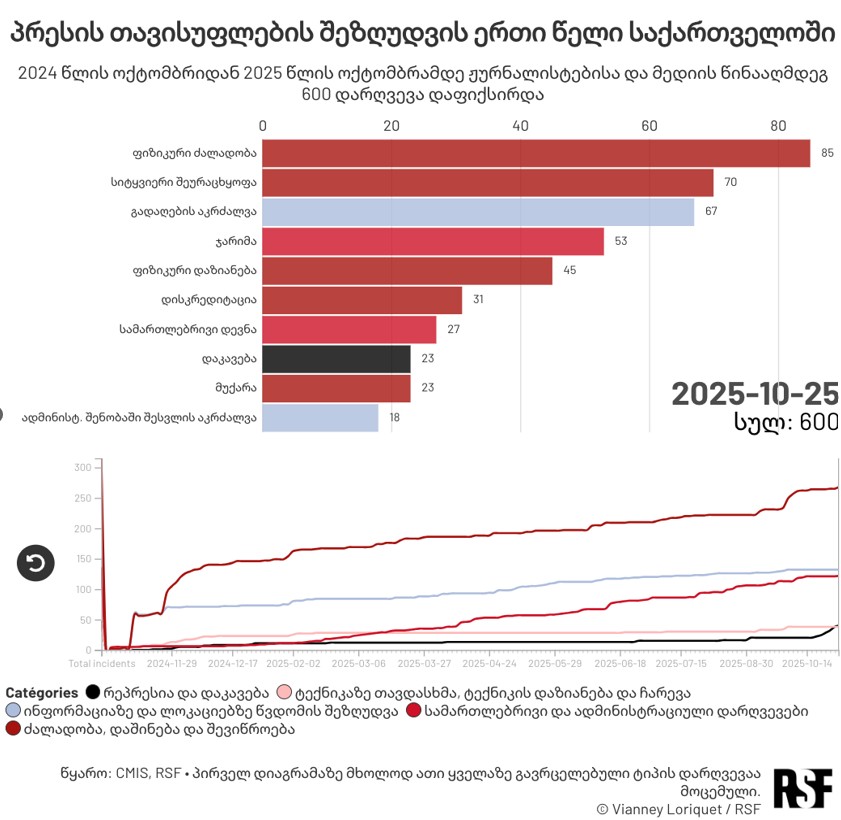 საქართველოში ერთ წელიწადში მედიაზე 600 თავდასხმა მოხდა – RSF უპრეცედენტო მასშტაბის რეპრესიებზე წერს