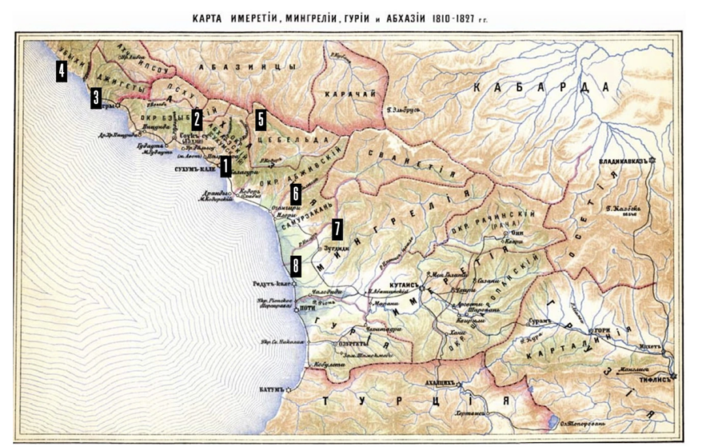 1. Сухум-Кале (Сухумская крепость) 2. Лихни 3. Джигетия 4. Убыхи 5. Цебельда 6. Абжуа 7. Зугдиди 8. Редут-Кале (Ахалцыхская крепость)